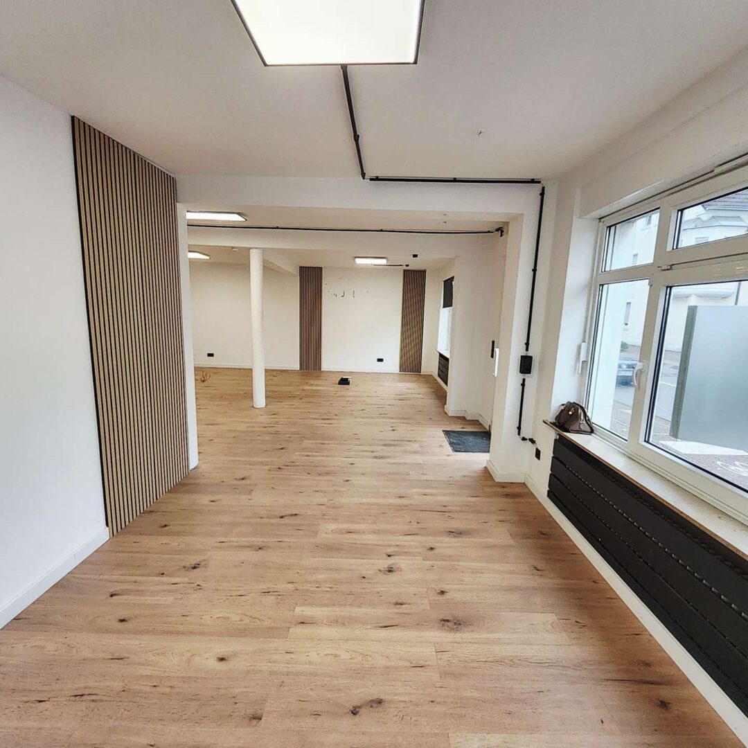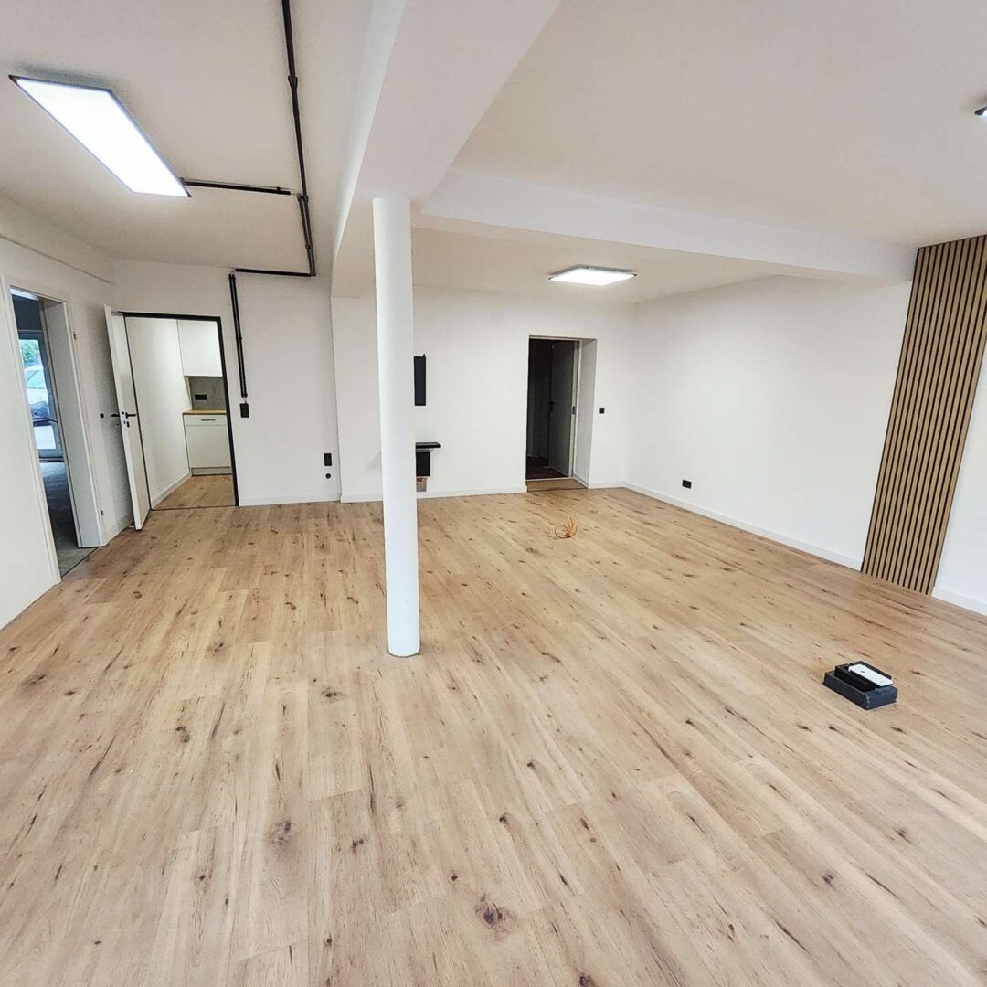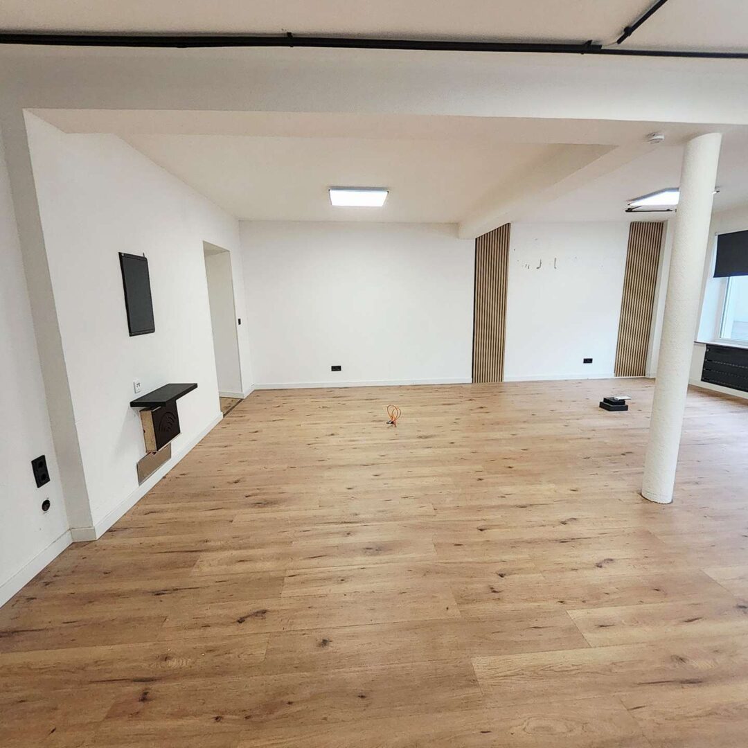Der Hauptraum beeindruckt mit seinem großzügigen, offenen Charakter und der modernen Gestaltung: helle Wände, stilvolle Holzbodenoptik und integrierte Lichtpaneele schaffen eine angenehme Arbeits- und Präsentationsatmosphäre. Dezente Akzente wie vertikale Holzlamellen und sichtbar geführte schwarze Leitungen verleihen dem Raum einen zeitgemäßen Loft-Charme.