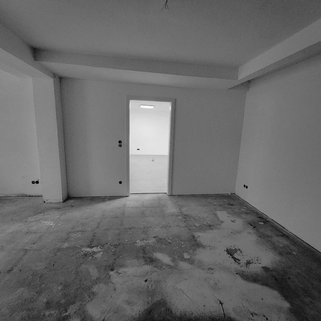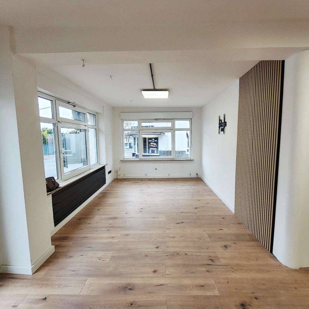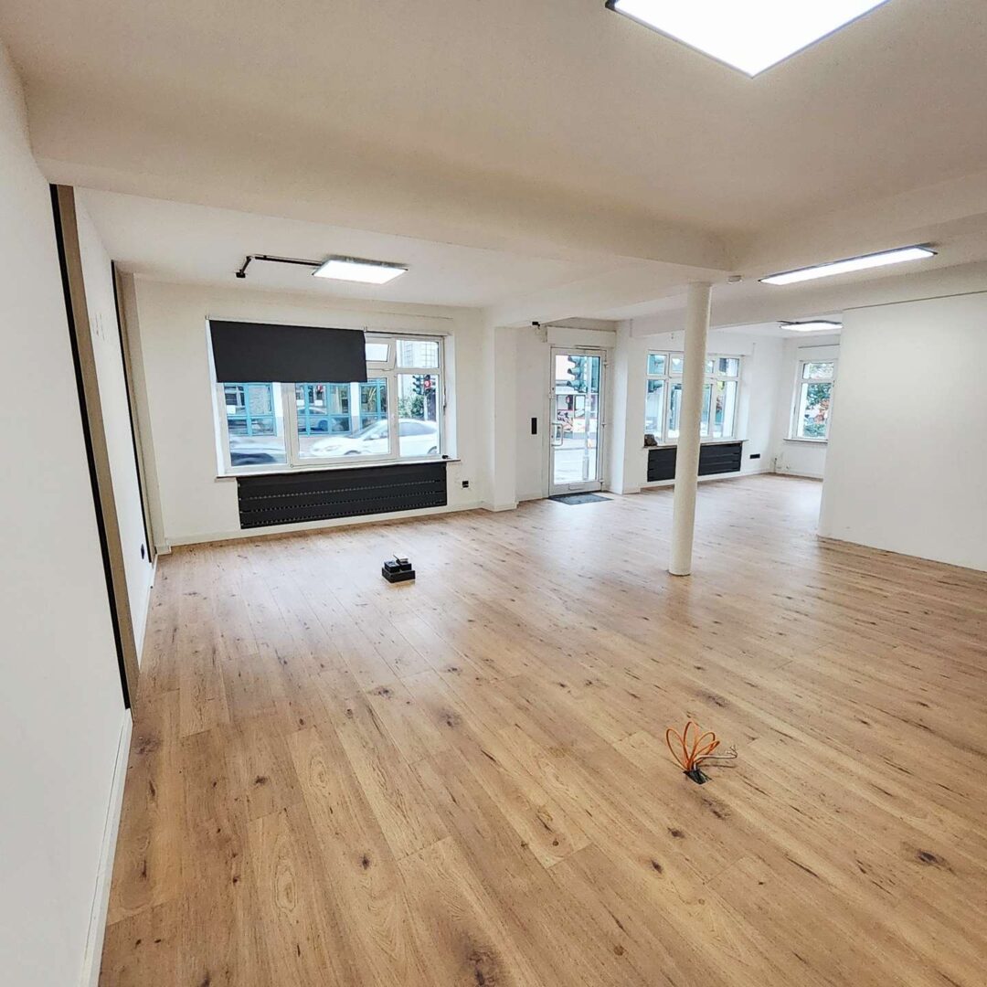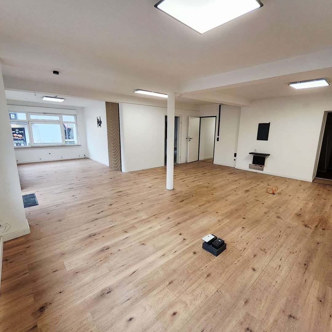 Der Hauptraum beeindruckt mit seinem großzügigen, offenen Charakter und der modernen Gestaltung: helle Wände, stilvolle Holzbodenoptik und integrierte Lichtpaneele schaffen eine angenehme Arbeits- und Präsentationsatmosphäre. Dezente Akzente wie vertikale Holzlamellen und sichtbar geführte schwarze Leitungen verleihen dem Raum einen zeitgemäßen Loft-Charme.