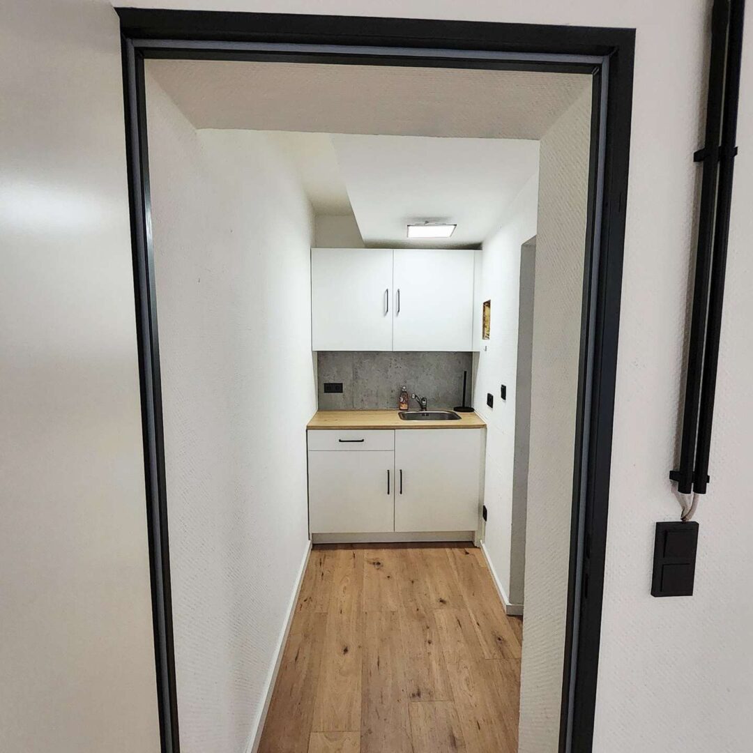 Eine kleine, funktional ausgestattete Küchenzeile bietet Platz für Pausen und die tägliche Versorgung. Die gesamte Fläche wurde hochwertig saniert und befindet sich in einem sehr gepflegten, bezugsfertigen Zustand.